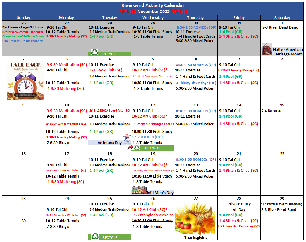 | MAJONG | 1st and 3rd Mondays | 1PM (Main Clubhouse) | Carol Bachmeyer |