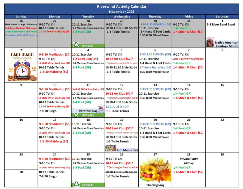 | Exercise – Tai Chi | Monday, Wednesday, Fridays | 9AM (Main Clubhouse) | Shirley Works/Lorraine Talbot |